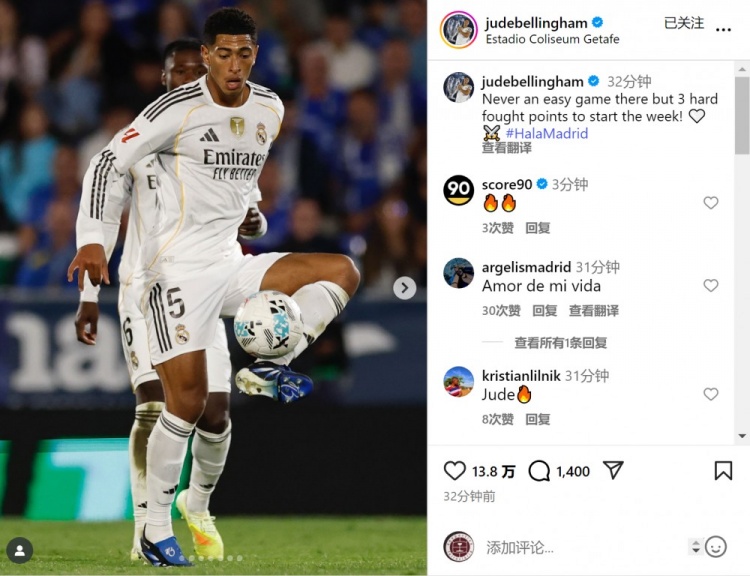 足球比分网10月20日讯 西甲第9轮比赛,贝林厄姆首发出战,皇马客场1-0击败赫塔费。 贝林厄姆社媒晒出比赛照片,配文:“在这里比赛从来都不轻松,但以一场苦战拿下三分,开启新的一周。”