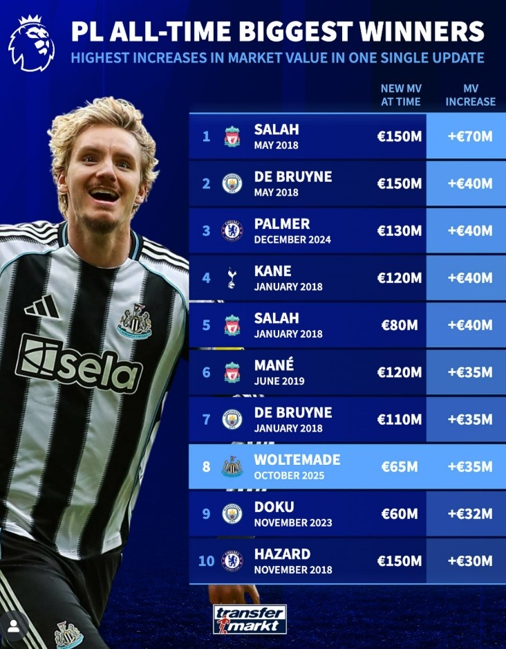足球比分网10月20日讯 德转此前更新了足坛球员身价,并盘点了英超球员在单次更新中身价涨幅最高的榜单,具体如下: 1、萨拉赫,2018年5月,1.5亿欧,+7000万欧 2、德布劳内,2018年,1.5亿欧,+4000万欧 3、帕尔默,2024年,1.3亿欧,+4000万欧 4、凯恩,2018年,1.2亿欧,+4000万欧 5、萨拉赫,2018年1月,8000万欧,+4000万欧 6、马内,2019年,1.2亿欧,+3500万欧 7、德布劳内,2018年1月,1.1亿欧 ,+3500万欧 8、沃尔特马德,2025年,6500万欧,+3500万欧 9、多库,2023年,6000万欧,+3200万欧 10、阿扎尔,2018年,1.5亿欧,+3000万欧 |