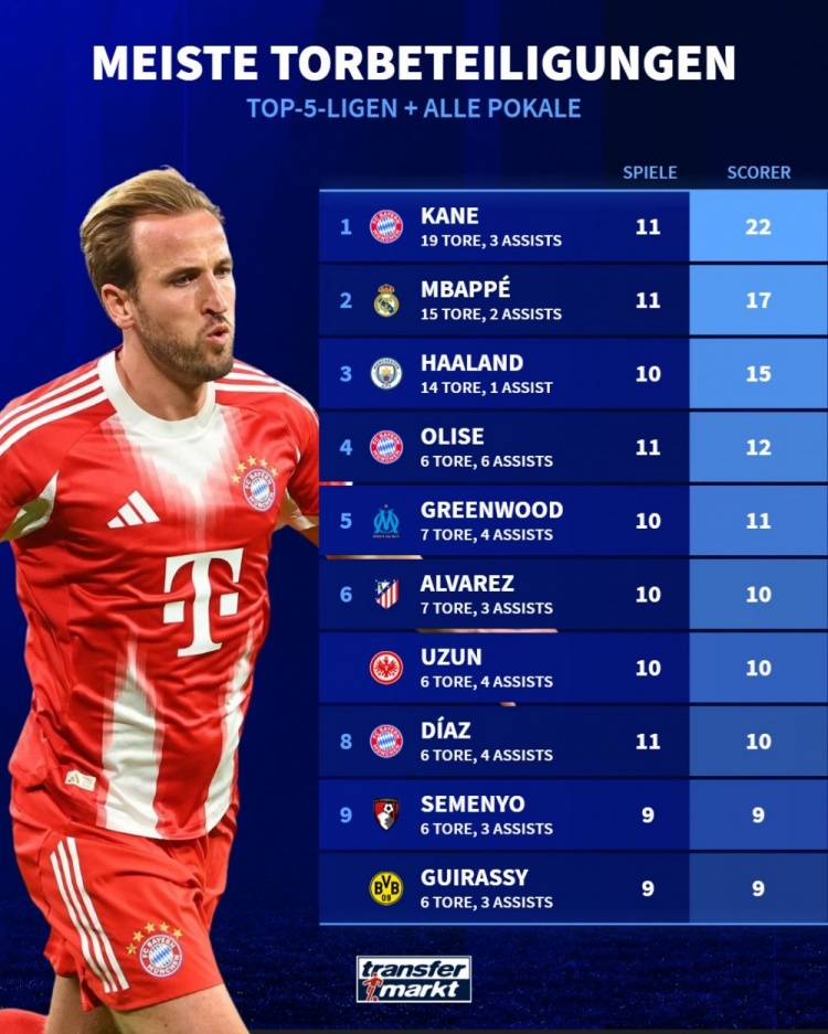 足球比分网10月20日讯 《转会市场》统计了本赛季五大联赛球员在俱乐部各项赛事的直接参与进球总数情况,凯恩、姆巴佩、哈兰德分列前三。 本赛季俱乐部各项赛事参与进球榜: 1.哈里-凯恩(拜仁),11场,19球3助,参与22球 2.姆巴佩(皇马),11场,15球2助,参与17球 3.哈兰德(曼城),10场,14球1助,参与15球 4.奥利塞(拜仁),11场,6球6助,参与12球 5.梅森-格林伍德(马赛),10场,7球4助,参与11球 6.胡利安-阿尔瓦雷斯(马竞),10场,7球3助,参与10球 7.乌尊(法兰克福),10场,6球4助,参与10球 8.路易斯-迪亚斯(拜仁),11场,6球4助,参与10球 9.塞梅尼奥(伯恩茅斯),9场,6球3助,参与9球 10.吉拉西(多特),9场,6球3助,参与9球