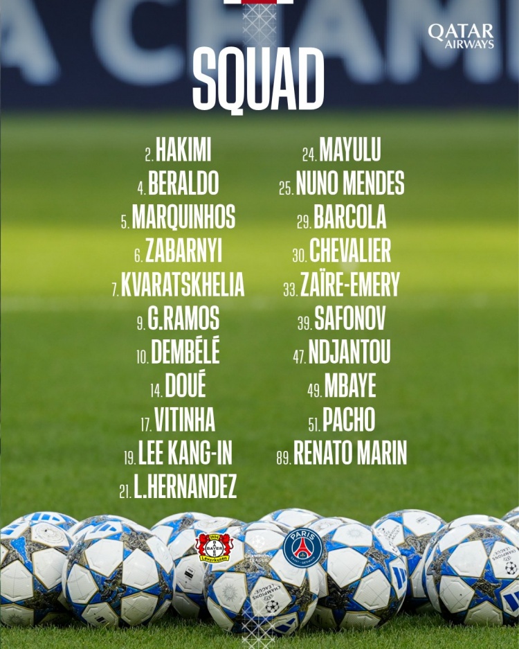 巴黎欧冠客战勒沃库森大名单:登贝莱在列,马