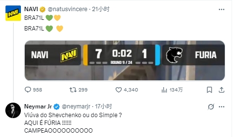 足球比分网10月20日讯 昨晚,巴西CS(反恐精英)战队FURIA(黑豹)在赛事TP世界锦标赛中让二追三,3-2逆转乌克兰战队NAVI,夺得赛事总冠军。 图一NAVI一度取得7-1领先,他们在官方社媒上发布了比分截图,配文“BRA71L”(意指2014年世界杯半决赛巴西1-7遭德国淘汰),以此来打趣对手。