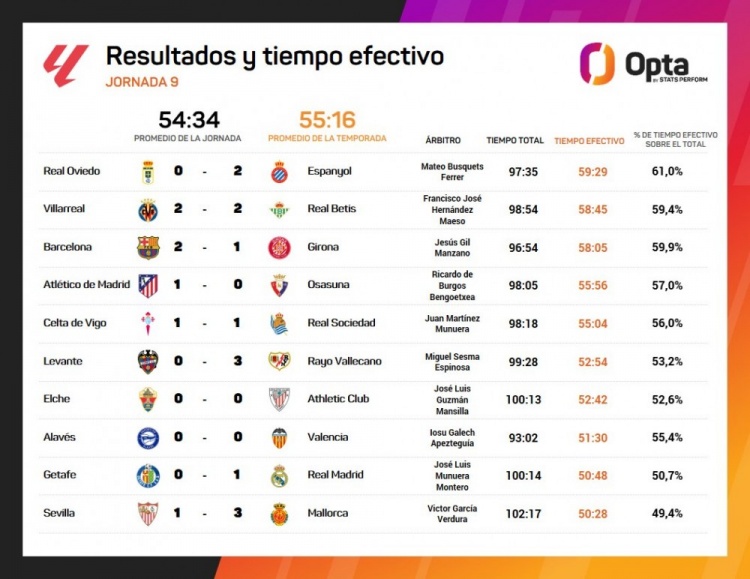足球比分网10月21日讯 OPTA统计了西甲第九轮各场比赛的有效时间,没有任何一场比赛的有效时间超过60分钟。 西甲第9轮各场比赛有效时间: 皇家奥维耶多0-2西班牙人,比赛时间97分35秒,有效时间59分29秒,占比61% 比利亚雷亚尔2-2皇家贝蒂斯,比赛时间98分54秒,有效时间58分45秒,占比59.4% 巴萨2-1赫罗纳,比赛时间96分54秒,有效时间58分05秒,占比59.9% 马竞1-0奥萨苏纳,比赛时间98分05秒,有效时间55分56秒,占比57.0% 塞尔塔1-1皇家社会,比赛时间98分18秒,有效时间55分04秒,占比56.0% 莱万特0-3巴列卡诺,比赛时间99分28秒,有效时间52分54秒,占比53.2% 埃尔切0-0毕尔巴鄂竞技,比赛时间100分13秒,有效时间52分42秒,占比52.6% 阿拉维斯0-0瓦伦西亚,比赛时间93分02秒,有效时间51分30秒,占比55.4% 赫塔费0-1皇家马德里,比赛时间100分14秒,有效时间50分48秒,占比50.7% 塞维利亚1-3马洛卡,比赛时间102分17秒,有效时间50分28秒,占比49.4%