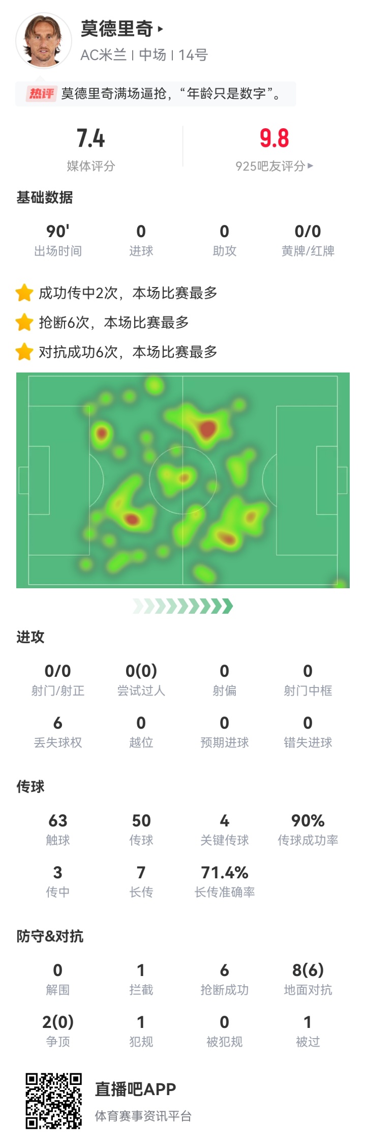 足球比分网10月20日讯 凌晨意甲第7轮,AC米兰2-1战胜佛罗伦萨。据媒体数据统计,莫德里奇在这场比赛中才吃到他来意甲后的首次犯规。 上半场比赛,莫德里奇踢到法齐尼被判犯规,这是他今夏加盟AC米兰后在意甲吃到了首次犯规,此前6场比赛,莫德里奇均未有过犯规。 莫德里奇vs佛罗伦萨数据↓