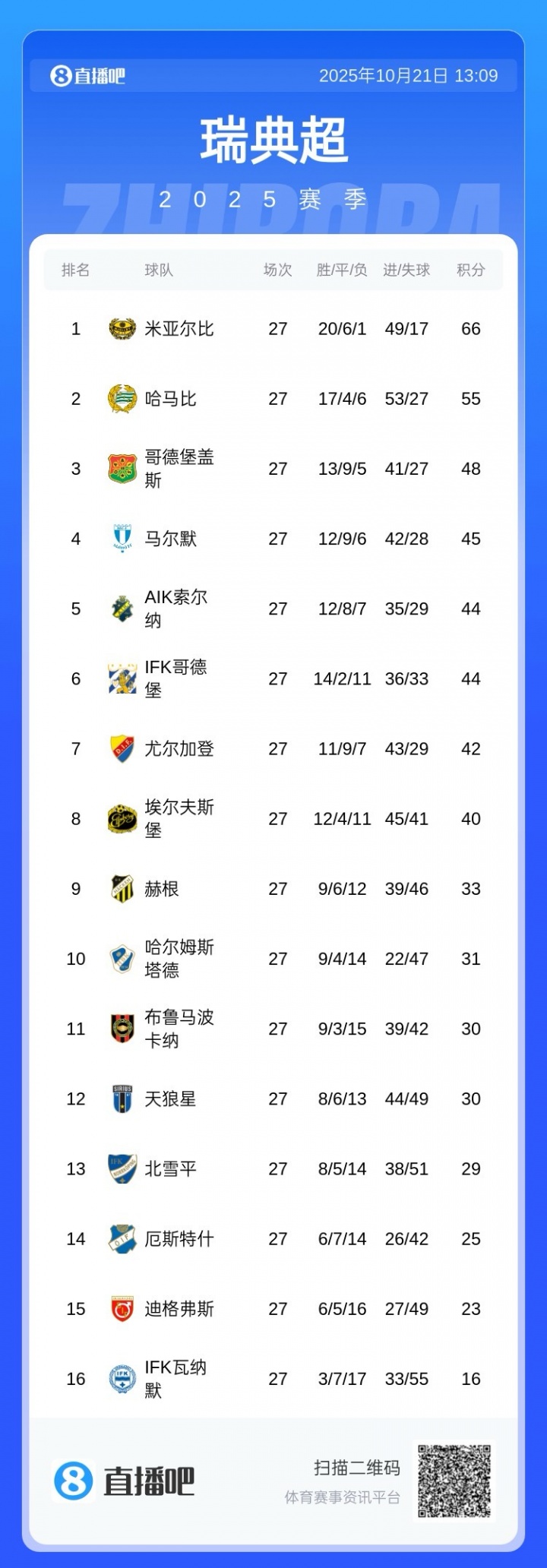 足球比分网10月21日讯 今日,瑞典超米亚尔比2-0战胜IFK哥德堡,提前3轮夺得瑞典超冠军。 米亚尔比位于一个小小渔村。根据最新数据,该村仅有1379名居民。 米亚尔比10年前降级至瑞典第三级别联赛,还差点降入第四级别,而如今米亚尔比已经拿下了瑞典顶级联赛的冠军! 球队历程: 2015年,米亚尔比降至瑞典足球第三级别联赛 2016年,米亚尔比在瑞典第三级别联赛中排名第8,惊险保级 2018年,米亚尔比夺冠,升至瑞典第二级别联赛 2019年,米亚尔比再度夺冠升级,升入瑞典超级联赛 2020年,米亚尔比在瑞典超级联赛排名第五,距离欧战只差2分 2025年,在连续五个赛季排在瑞典顶级联赛前十之后,本赛季米亚尔比夺冠!下赛季将参加欧冠附加赛