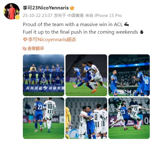 李可社媒:为亚冠胜利而骄傲,接下来几周的最