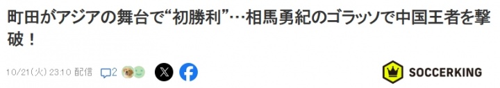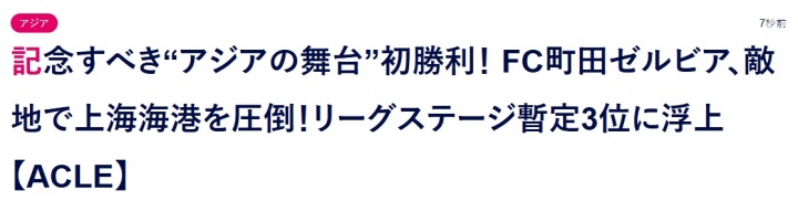 足球比分网10月21日讯 亚冠精英联赛东亚区第3轮,上海海港主场0-2不敌亚冠新军町田泽维亚,送对手队史亚冠首胜。 赛后部分日媒的报道标题包括:《值得纪念的“亚洲舞台”首胜!町田泽维亚客场爆冷击败上海海港,暂居亚冠精英联赛第三》、《町田在亚洲赛场的首胜!相马勇纪的精彩进球帮助球队击败了中国冠军》等。