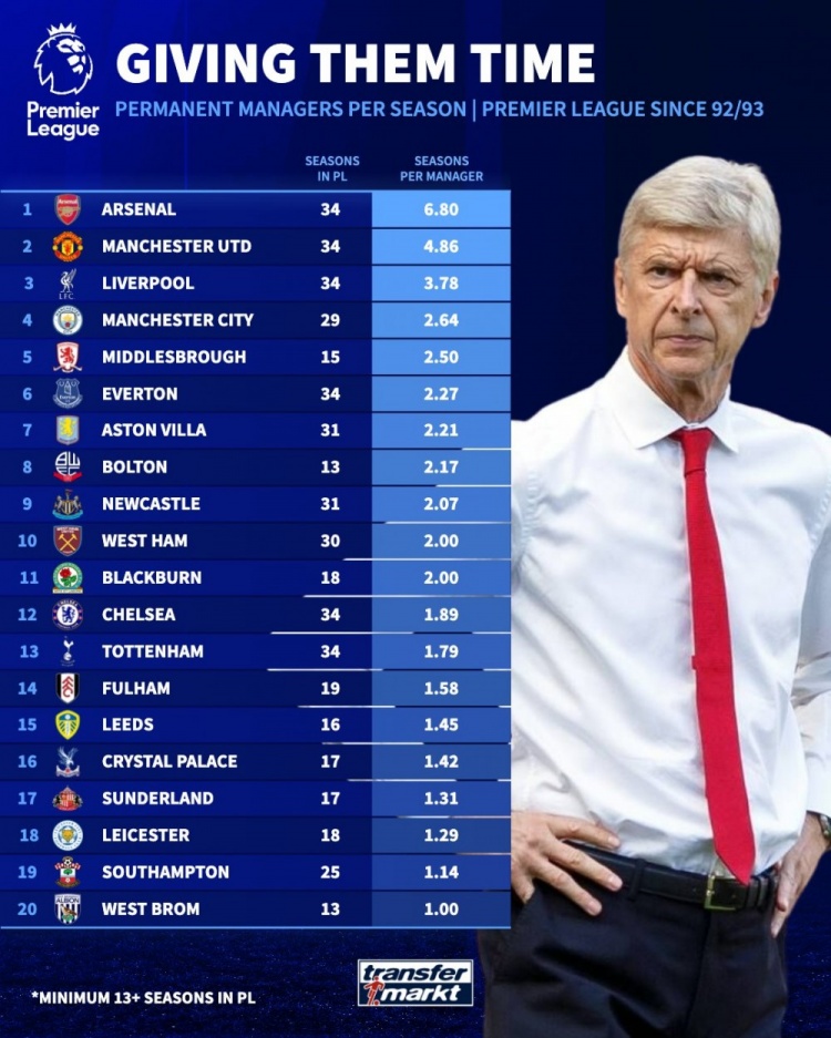 英超各队历任主帅平均执教时长:阿森纳、曼联