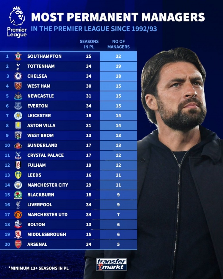 英超历史正式主帅换帅榜:热刺19次、切尔西18次