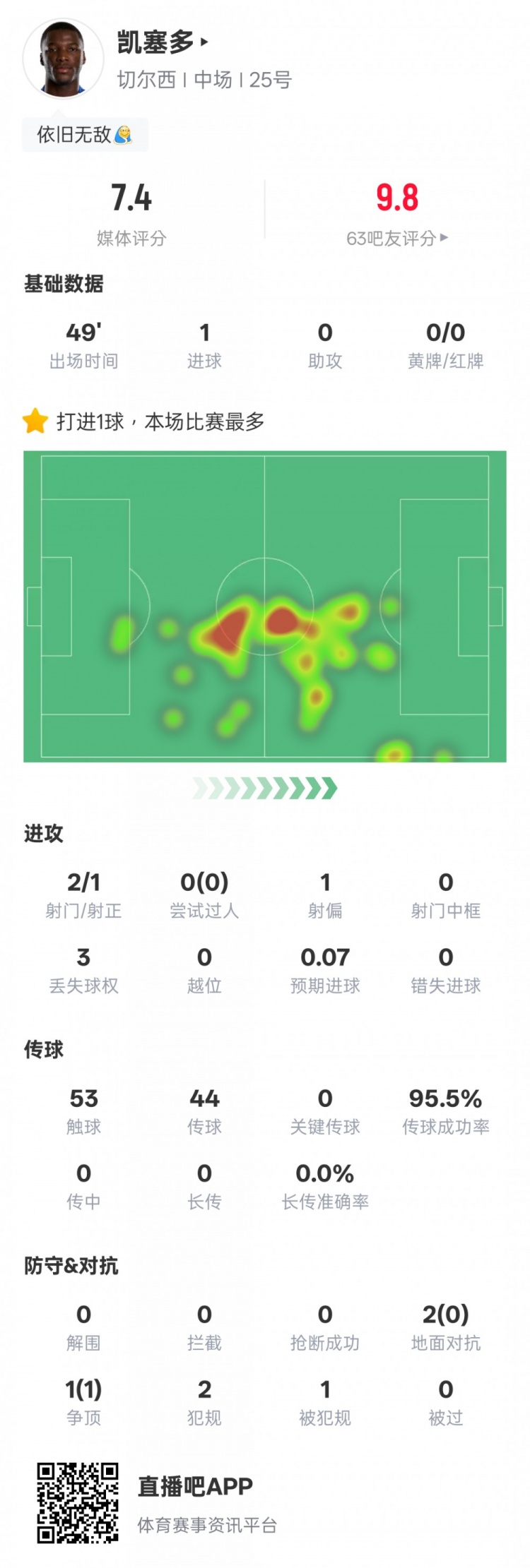 凯塞多本场比赛数据:1射正1进球+传球成功率9