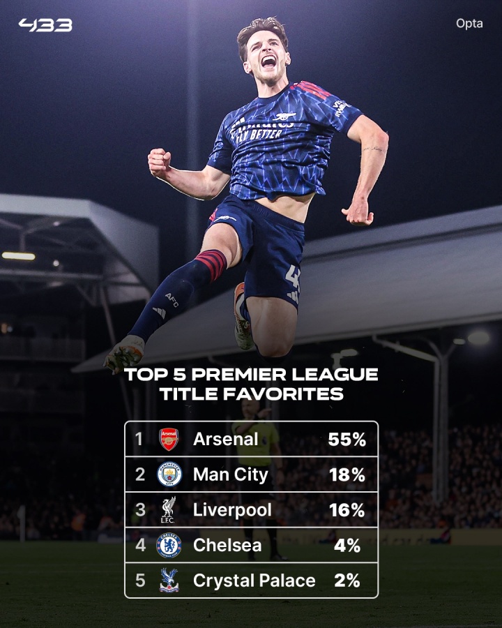 英超夺冠概率: 1.阿森纳:55% 2.曼城:18% 3.利物浦:16% 4.切尔西:4% 5.水晶宫:2% |