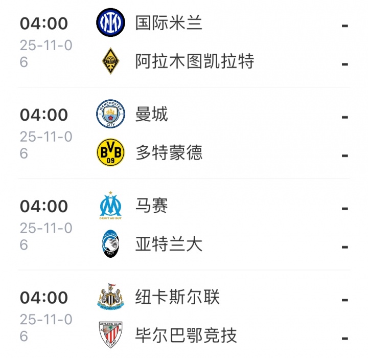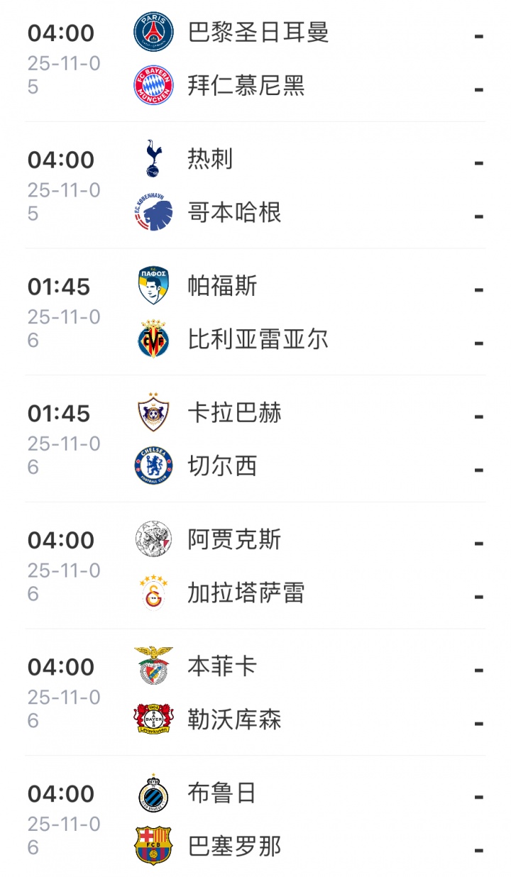 足球比分网10月23日讯 欧冠第3轮比赛全部结束,36支球队在2天内打完了18场比赛。第4轮比赛将在北京时间11月5日-6日凌晨进行,将依旧在2天内打完18场比赛。与前2轮不同的是,第4轮开始时将处于欧洲冬令时,所有比赛将会晚1小时开赛。 欧冠联赛阶段第4轮预告↓