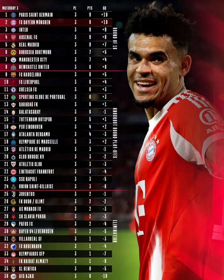 下轮与巴黎争夺榜首!拜仁晒欧冠积分榜:两周