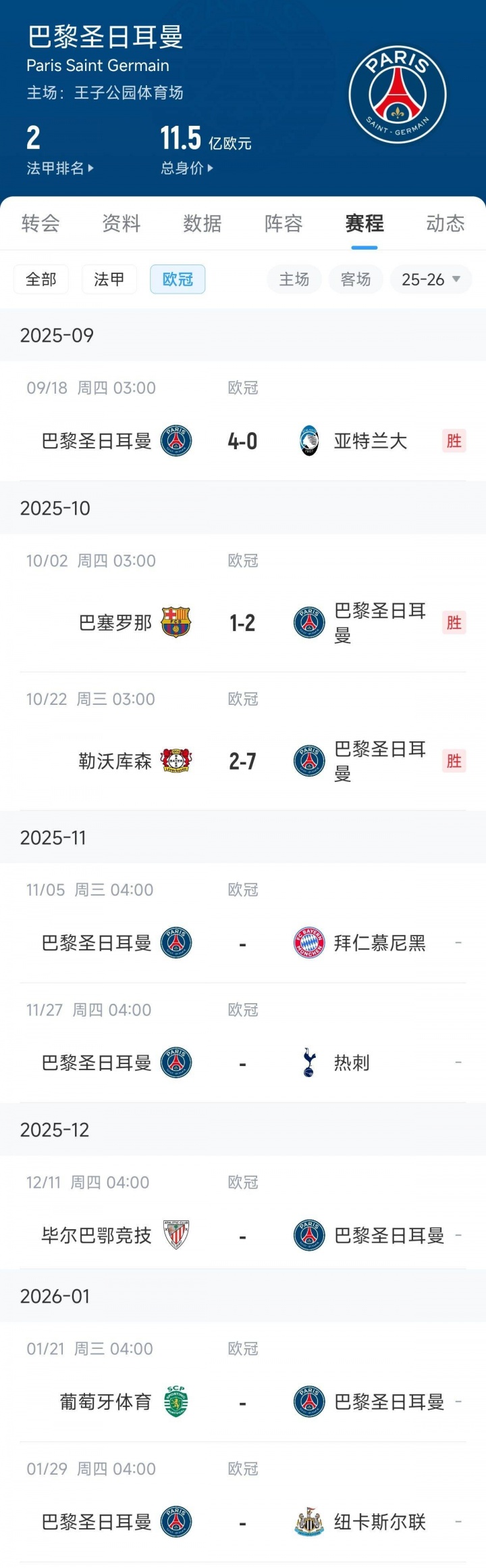 足球比分网10月22日讯 欧冠联赛阶段第3轮,巴黎客场7-2大胜勒沃库森,再次制造惨案。 作为卫冕冠军,巴黎本赛季的欧冠赛程难度颇高。但是目前球队3轮战罢,暂时排在欧冠积分榜第1,前3轮摧枯拉朽豪取3连胜:4-0亚特兰大、2-1巴塞罗那、7-2勒沃库森。 后续,巴黎还将对阵拜仁、热刺、毕尔巴鄂竞技、葡萄牙体育、纽卡斯尔,赛程也有些魔鬼。不过,真正的“魔鬼”也许是卫冕冠军大巴黎。