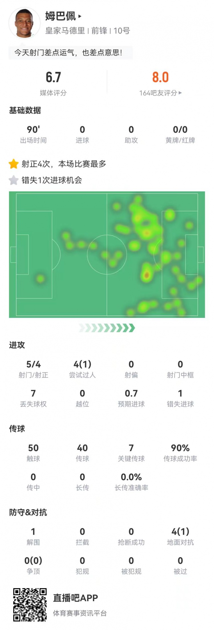 姆巴佩本场5射4正1失良机 7关键传球+4过人1成功
