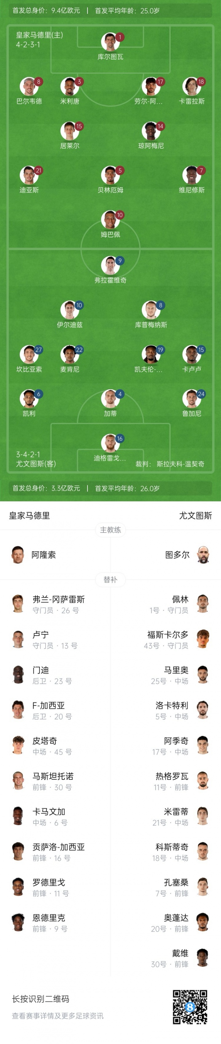 皇马vs尤文首发:姆巴佩领衔、马斯坦托诺替补,
