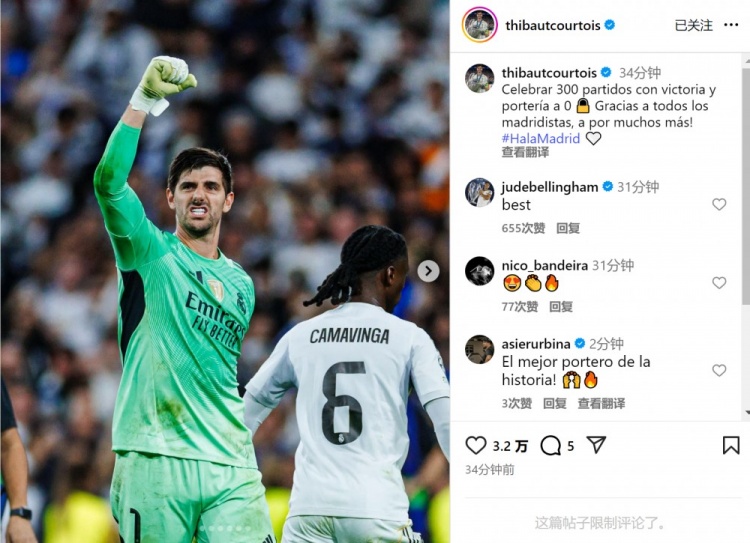 足球比分网10月23日讯 欧冠联赛阶段第三轮比赛,库尔图瓦完成零封,帮助皇马主场1-0击败尤文。 此役是库尔图瓦为皇马出战的第300场比赛,他在社交媒体上写道:“以胜利和零封庆祝300场里程碑!感谢所有皇马球迷,未来还有更多场比赛!”
