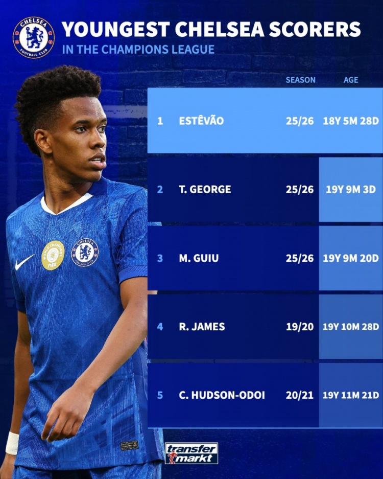 足球比分网10月23日讯 本轮欧冠比赛,埃斯特旺、乔治、吉乌破门,切尔西5-1击败阿贾克斯。德国转会市场列出了切尔西队史欧冠最年轻进球者排名,埃斯特旺、乔治、吉乌排名前三。 切尔西队史欧冠最年轻进球者排名: 埃斯特旺(25-26)——18岁5月28天 乔治(25-26)——19岁9月3天 吉乌(25-26)——19岁9月20天 里斯-詹姆斯(19-20)——19岁10月28天 奥多伊(20-21)——19岁11月21天 |