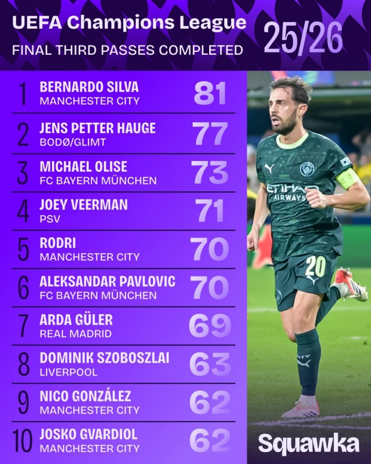 足球比分网10月23日讯 本赛季欧冠联赛阶段已战罢3轮,Squawka统计了到目前为止球员完成进攻三区传球次数榜,曼城中场B席81次第一,博德闪耀攻击手海于格77次第二。 本赛季欧冠球员完成进攻三区传球次数榜: 1.B席(曼城):81 2.海于格(博德闪耀):77 3.奥利塞(拜仁):73 4.威尔曼(埃因霍温):71 5.罗德里(曼城):70 6.帕夫洛维奇(拜仁):70 7.居莱尔(皇马):69 8.索博斯洛伊(利物浦):63 9.尼科-冈萨雷斯(曼城)62 10.格瓦迪奥尔(曼城):62