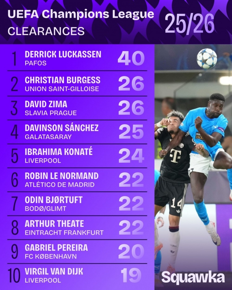 本赛季欧冠解围榜:卢卡森40次断崖式领先,科纳