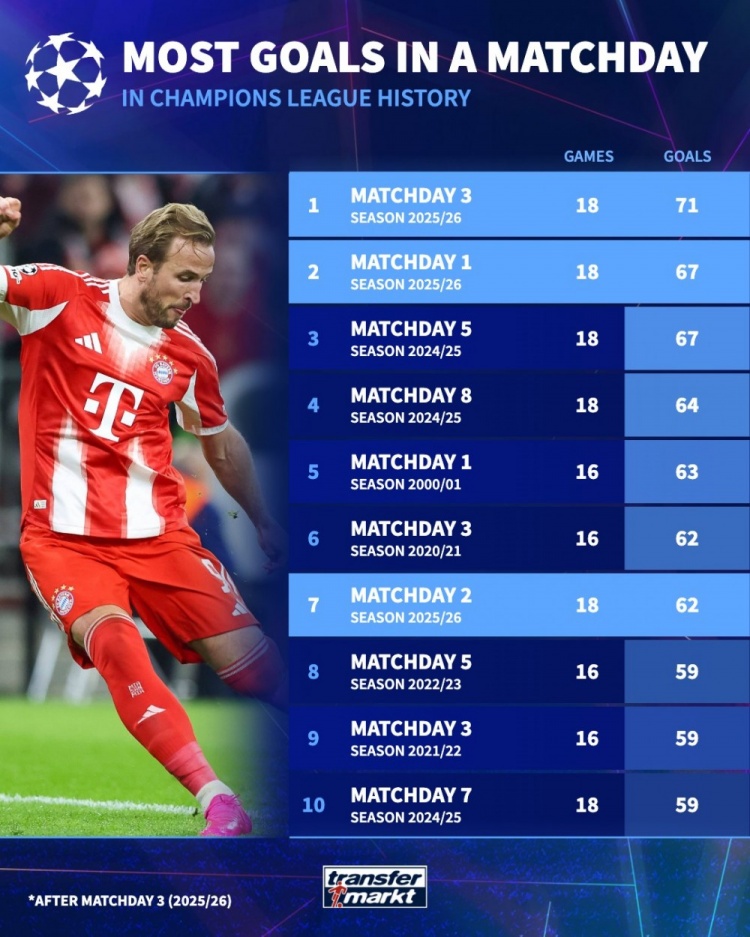 足球比分网10月23日讯 德国转会市场统计了欧冠单轮比赛进球数量,并列出欧冠历史单一轮次进球排名,本轮欧冠打进71球居首。 欧冠历史单轮进球排名: 25-26赛季第三轮——18场71球 25-26赛季第一轮——18场67球 24-25赛季第五轮——18场67球 24-25赛季第八轮——18场64球 00-01赛季第一轮——16场63球 20-21赛季第三轮——16场62球 25-26赛季第二轮——18场62球 22-23赛季第五轮——16场59球 21-22赛季第三轮——16场59球 24-25赛季第七轮——18场59球 |