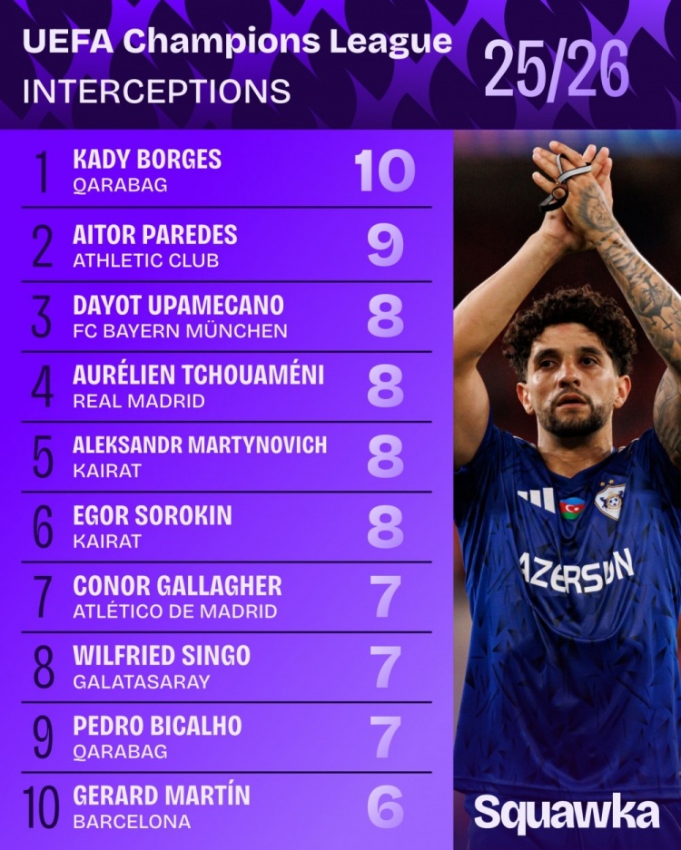 足球比分网10月23日讯 欧冠第3轮已经完赛,数据机构squakwa统计了本赛季至今的欧冠拦截情况, 本赛季欧冠拦截榜: 1.卡迪-博尔热斯,卡拉巴赫,10次 2.艾托尔-帕雷德斯,毕尔巴鄂竞技,9次 3.达约-于帕梅卡诺,拜仁慕尼黑,8次 4.奥雷利昂-琼阿梅尼,皇家马德里,8次 5.亚历山大-马丁诺维奇,凯拉特,8次 6.叶戈尔-索罗金,凯拉特,8次 7.康纳-加拉格尔,马德里竞技,7次 8.威尔弗里德-辛戈,加拉塔萨雷,7次 9.佩德罗-比卡略,卡拉巴赫,7次 10.赫拉德-马丁,巴塞罗那,6次