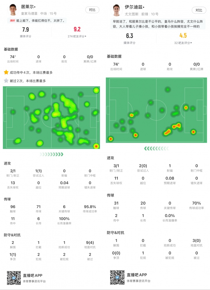 足球比分网10月23日讯 欧冠联赛阶段第3轮,皇马主场1-0尤文,居莱尔与伊尔迪兹均首发出场74分钟被换下,居莱尔当选MVP,伊尔迪兹被打全场第二低分。 居莱尔20岁身价6000万欧,本场获评7.9分,攻守两端均有亮眼数据,被欧冠官方评选为全场最佳球员。他2次射门1次射正,1次尝试过人成功,13次丢失球权,96次触球,71次传球,传球成功率95.8%,6次关键传球,6次长传全部成功,2次解围、1次拦截、1次成功抢断,9次地面对抗4次成功,1次争顶成功,2次犯规,2次被犯规,2次被过。
