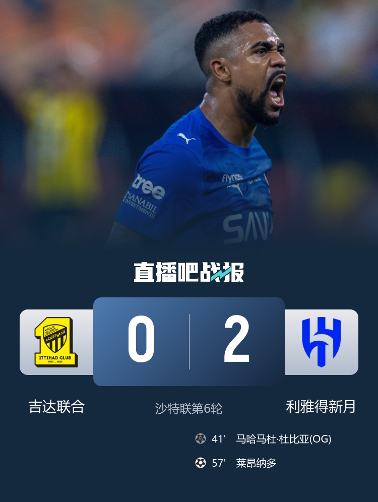 沙特联本轮焦点大战,吉达联合0-2不敌新月,莱昂纳多破门,杜比亚乌龙。 【其他新闻】 BBC:B费有6500万欧解约条款,他无意去沙特但会考虑其他欧洲联赛