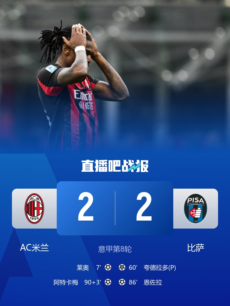 【比赛战报】 先赛只领先2分!米兰2-2比萨各赛事8场不败 莱奥破门阿特卡梅绝平 榜首危?意甲积分榜:米兰先赛只领先2分,国米将客战那不勒斯
