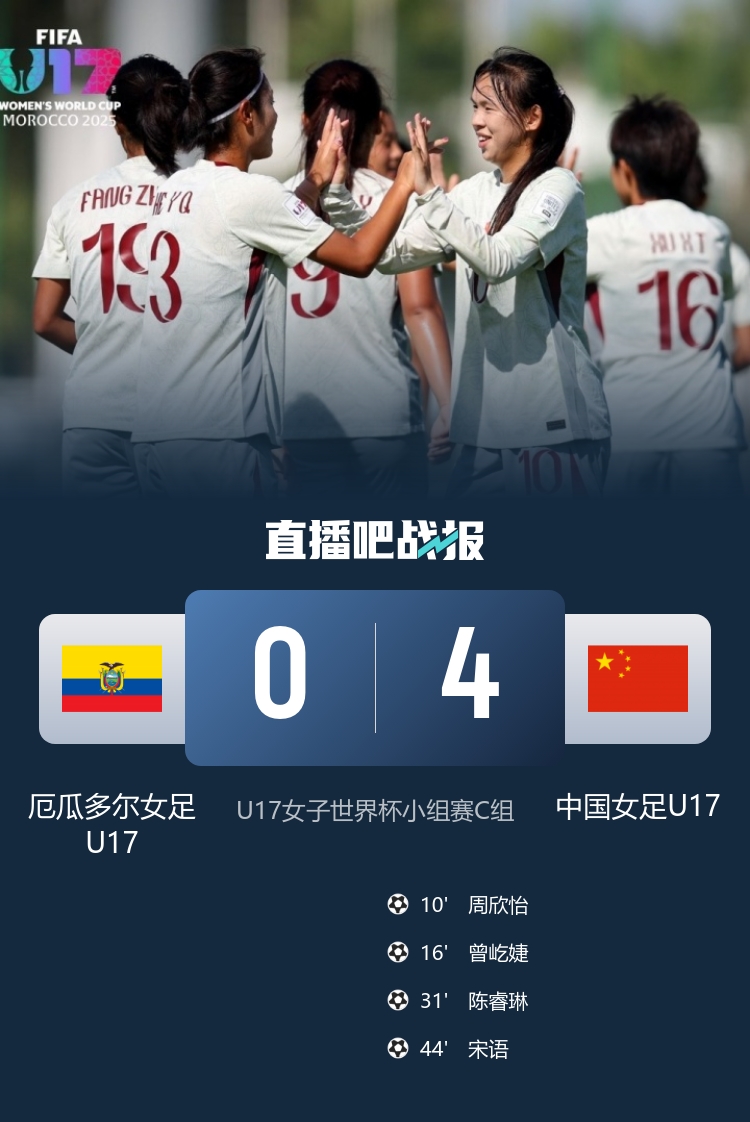 U17女子世界杯小组赛C组,中国对阵厄瓜多尔,周欣怡、曾屹婕、陈睿琳、宋语先后破门,中国队4-0取胜,小组第二晋级16强。 沙特联-利雅得新月2-0客胜吉达联合暂升第三 莱昂纳多破门