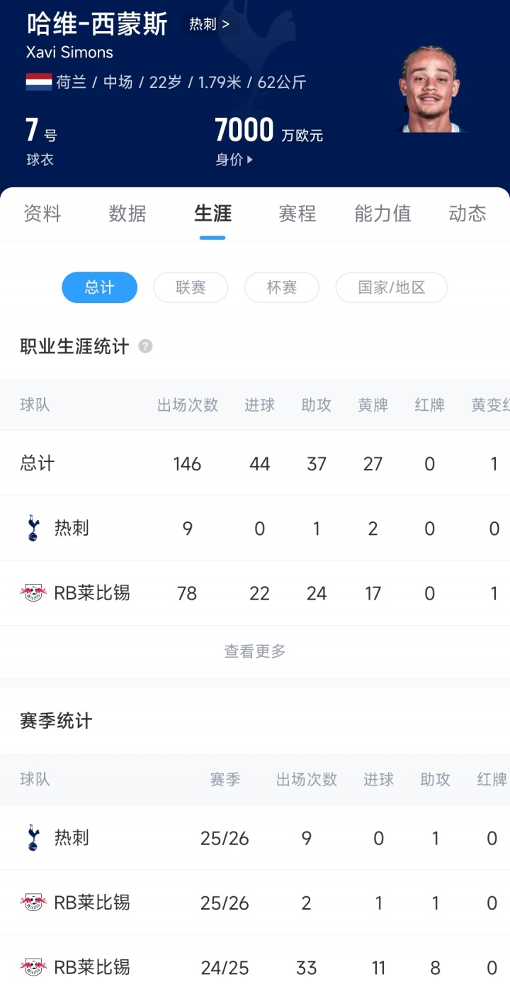 足球比分网10月24日讯 欧冠联赛阶段第3轮,热刺客场0-0战平摩纳哥,近5场比赛仅取得1胜。热刺中场西蒙斯此役替补出场30分钟,没能帮助球队改写比分。 本赛季加盟热刺后,哈维-西蒙斯已经代表球队出战了9场比赛,出场时间529分钟,贡献1次助攻,没有取得进球,热刺的战绩相比开季时也急转直下。 今年夏窗,热刺花费6500万欧元,从RB莱比锡签下哈维-西蒙斯,哈维-西蒙斯与热刺签下了一份5年的合同,周薪19.5万英镑。目前22岁的西蒙斯德转身价为7000万欧元。