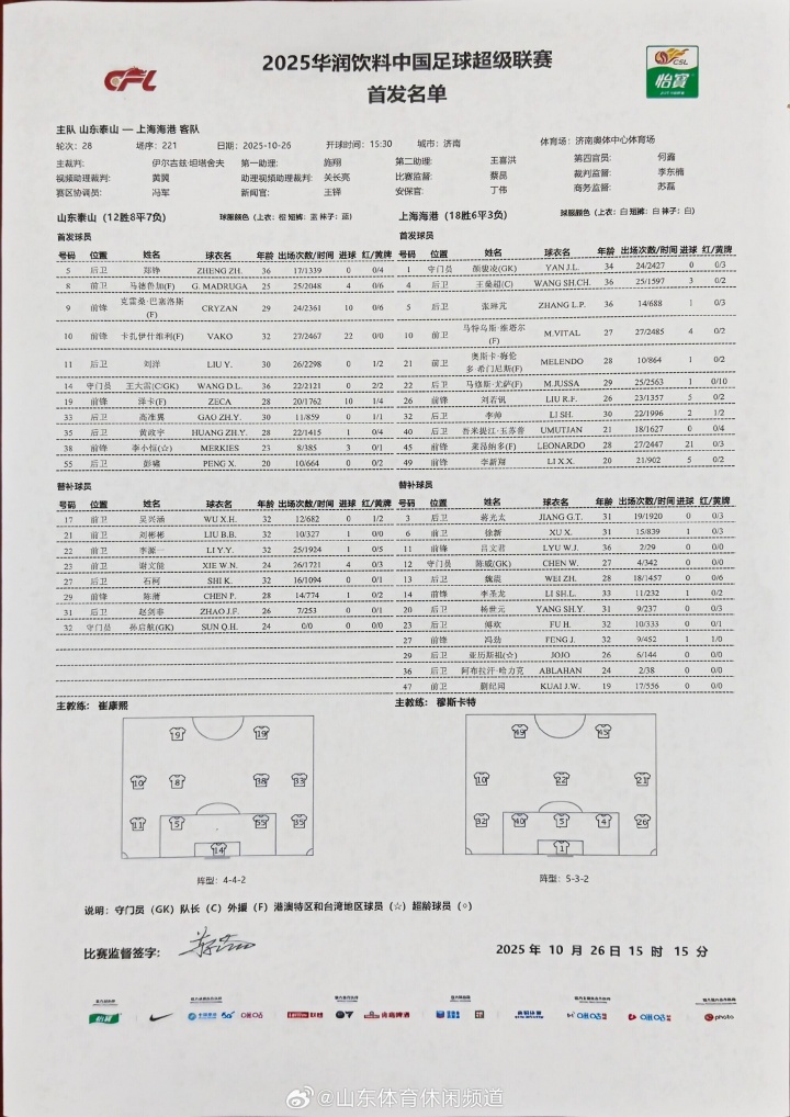 泰山战海港临场更换首发!彭啸首发,洛佩斯取 时间: 2025-10-26 来源: 网络 作者: admin 足球比分网10月26日讯 中超第28轮,山东泰山主场迎战上海海港,比赛临近开球前,泰山首发名单调整,彭啸首发,洛佩斯取消首发。 上一篇:完美开局!刘若钒送精妙传中,李新翔抢点破门 下一篇:硬碰硬!泰山vs海港赛前进行了暖场节目——摔跤
