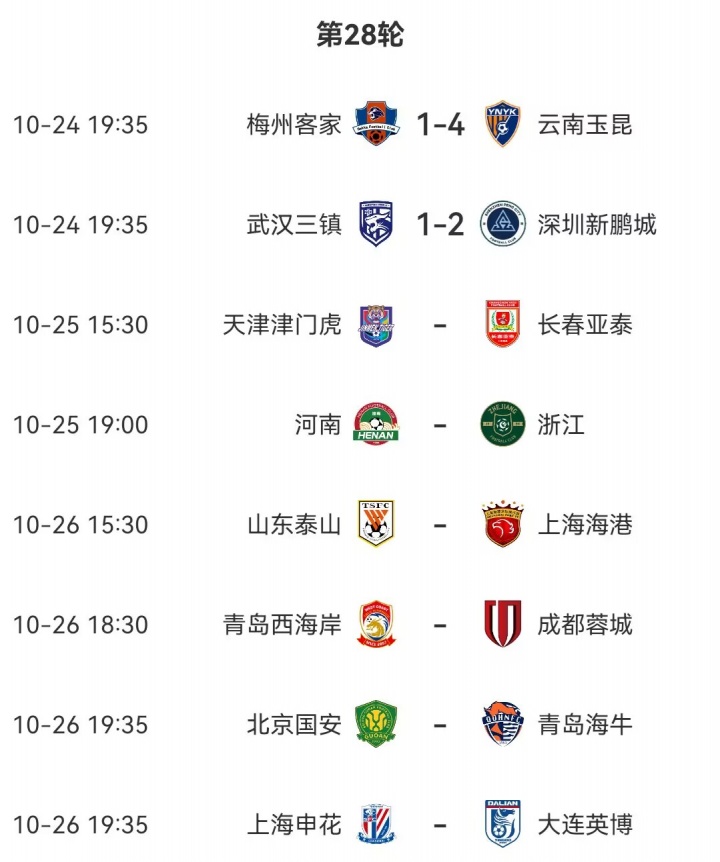 足球比分网10月25日讯 中超第28轮,长春亚泰客场2-2遭津门虎绝平。 保级形势上,亚泰本场比赛收获1分,共积19分,仍落后梅州1分,排名倒数第2位居降级区;海牛积18分垫底,明日将战国安。 中超积分榜: