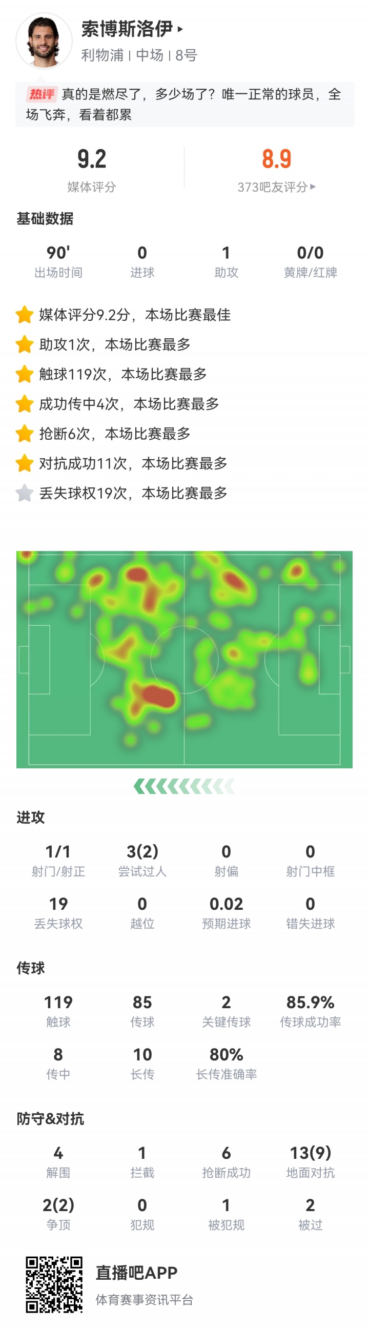 足球比分网10月26日讯 凌晨英超第9轮,利物浦2-3不敌布伦特福德,利物浦全队大部分球员的表现都被球迷批评,除了送出一次助攻的索博斯洛伊。 本场比赛索博斯洛伊在后腰的位置上踢满了全场,多项数据全场最高,其中包括6次抢断和11次对抗成功,萨拉赫最后时刻的进球也是索博抢断后送出的助攻。最终机构为索博本场比赛表现评分9.2,全场最高。