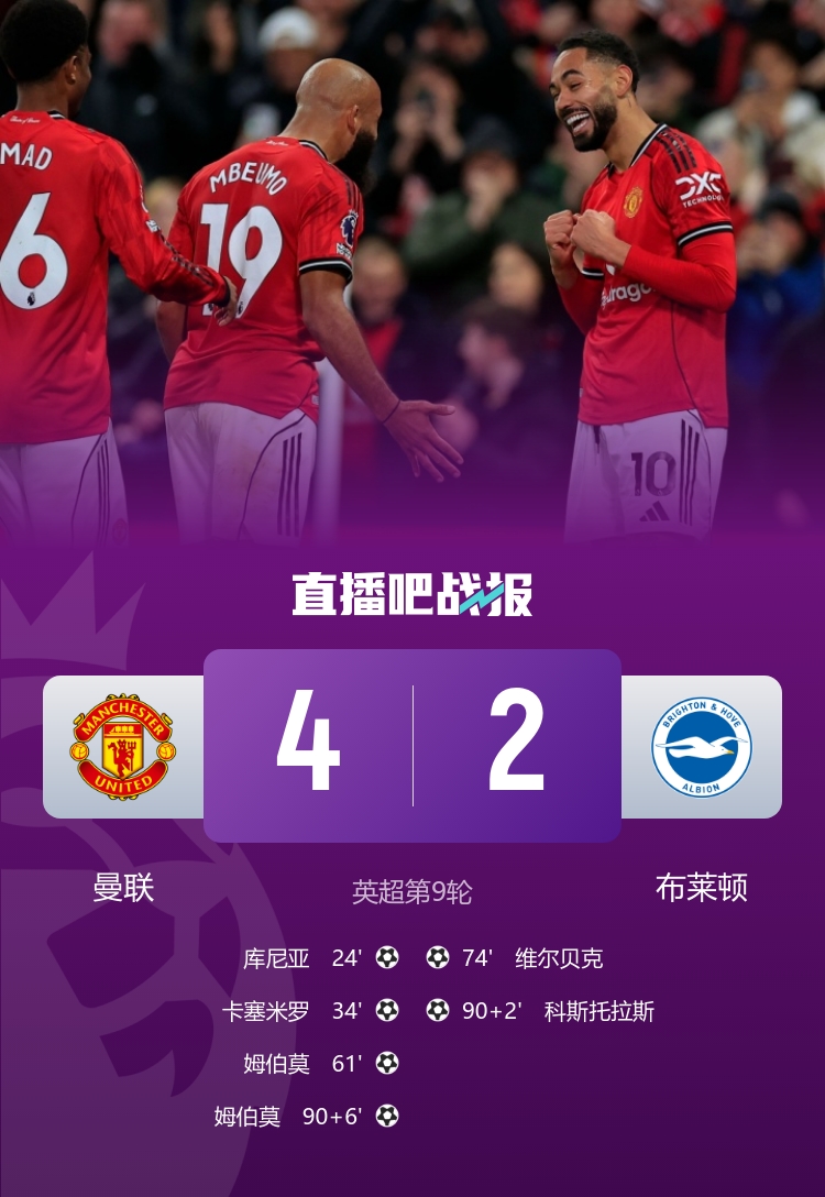 深陷危机!利物浦联赛4连败跌至第6,各赛事近6场仅1胜;范戴克送点,萨拉赫、科尔克兹破门。 曼联4-2布莱顿取三连胜 姆伯莫双响卡塞米罗传射库尼亚破门