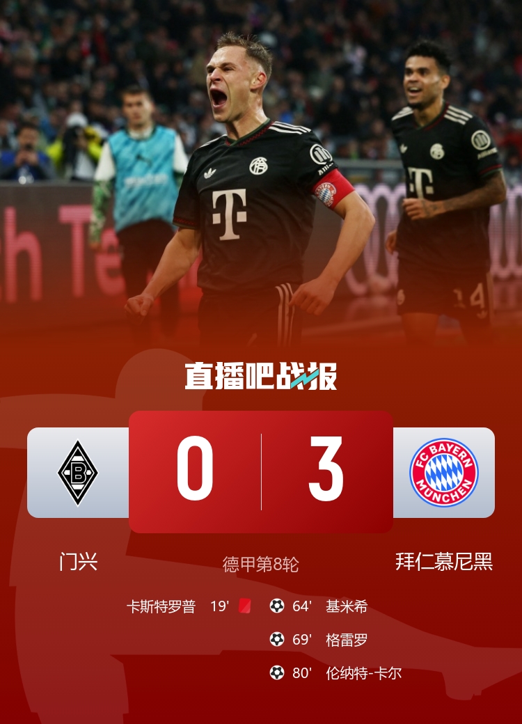 拜仁豪取德甲开赛8连胜,5分领跑积分榜,17岁卡尔轰世界波,基米希建功;门兴遭8轮不胜继续垫底。 巴黎3-0布雷斯特 阿什拉夫双响维蒂尼亚、克瓦拉茨赫利亚献助攻