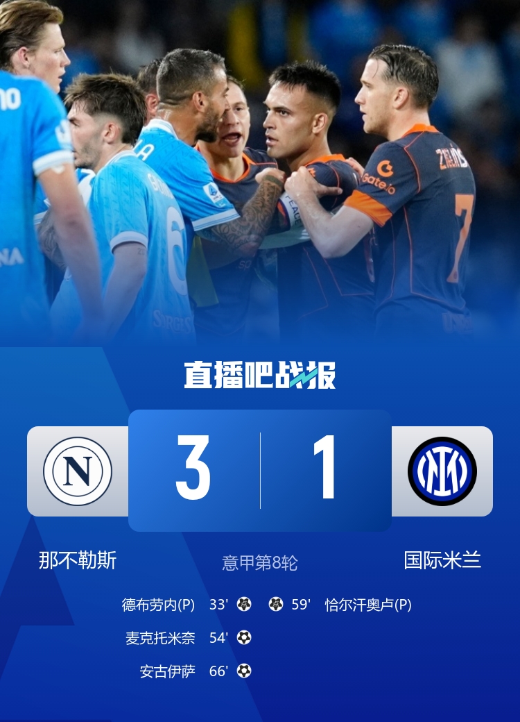 墨菲单刀破门+中柱随后失大单刀,卢基奇头球补射扳平,吉马良斯推射绝杀。 登顶!那不勒斯3-1终结国米4连胜 迪洛伦佐争议造点丁丁点射+伤退 意甲积分榜:那不勒斯重返榜首!米兰第2国米连胜终结排名第4