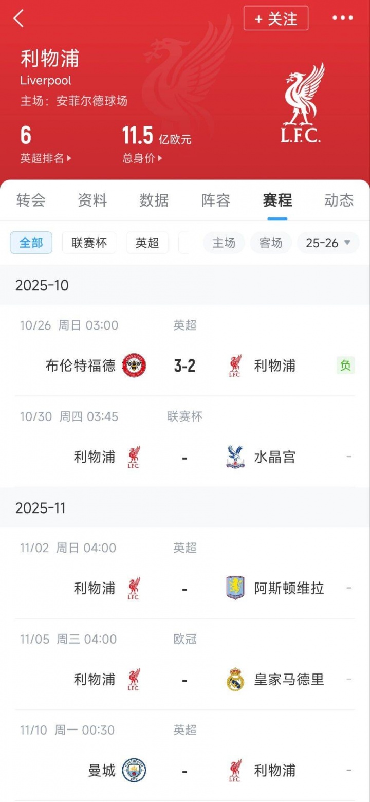 足球比分网10月26日讯 英超第9轮利物浦2-3不敌布伦特福德,遭遇英超四连败。 但是来不及调整状态,利物浦接下来的赛程依旧凶险。他们将在下周中联赛杯对阵劲敌水晶宫,随后的两轮英超维拉和曼城将带来挑战。而在这期间,欧冠赛场上红军还将迎战西甲豪门皇马。
