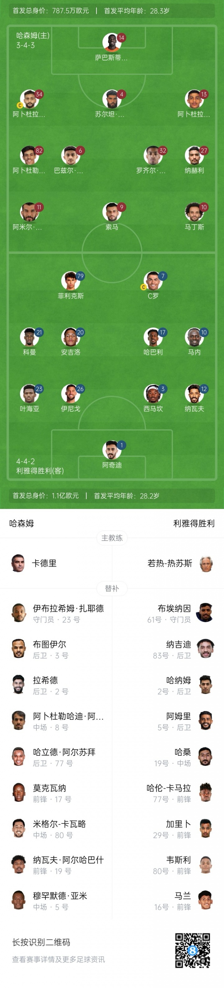 利雅得胜利客战哈森姆首发:C罗、菲利克斯、科