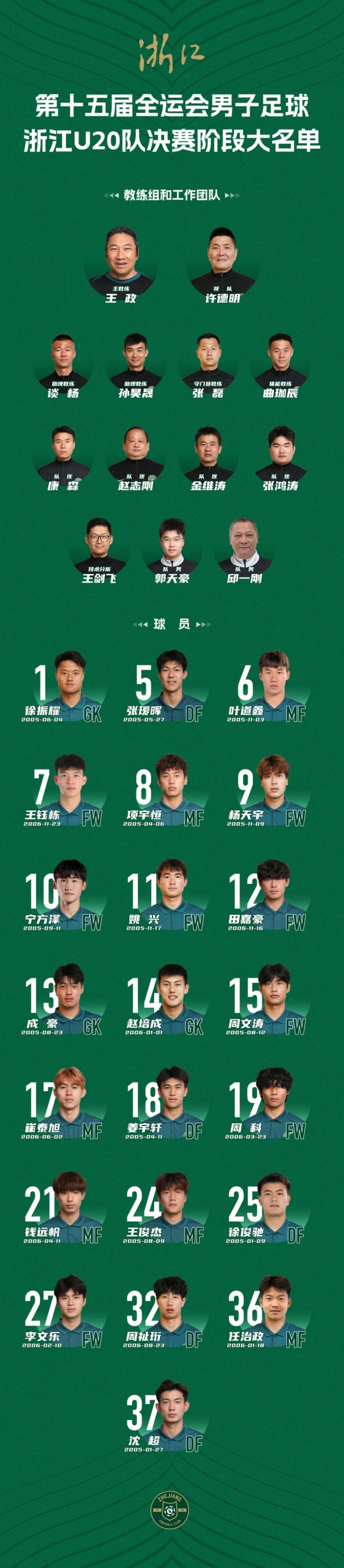 足球比分网10月28日讯 第十五届全运会即将展开男足U20决赛阶段的较量,浙江队今日公布参赛名单,其中包括了王钰栋和张瑷晖等球员。这支球队将由原浙江绿城主教练王政挂帅,绿城旧将张磊、谈杨担任助理教练。 王钰栋和张瑷晖都是浙江队一线队的主力球员,本赛季王钰栋在中超出场27次、张瑷晖在中超出场11次。此外王俊杰、徐振耀等一线队球员,也在本次全运会报名名单中。 根据赛程安排,浙江全运U20队在首轮比赛中轮空,随后将在11月3日和11月5日先后对阵新疆和山东,而这一比赛时间不会与中超联赛重叠。