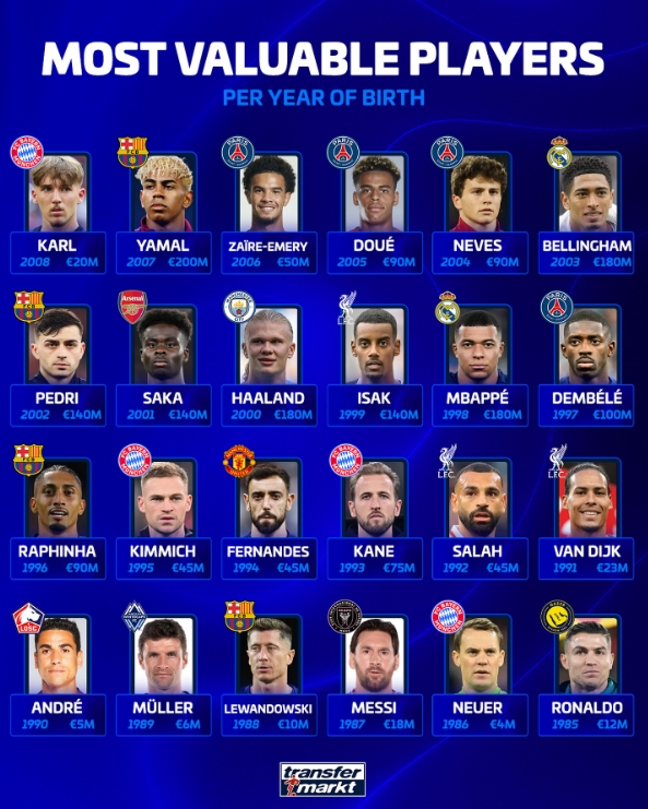 足球比分网10月27日讯 德转统计了各年龄段身价最高球员,其中,梅西、C罗、哈兰德、姆巴佩等人在列。 各年龄段身价最高球员: 00后 2008年:卡尔-2000万欧(拜仁) 2007年:亚马尔-2亿欧(巴萨) 2006年:埃梅里-5000万欧(巴黎) 2005年:杜埃-9000万欧(巴黎) 2004年:内维斯-9000万欧(巴黎) 2003年:贝林厄姆-1.8亿欧(皇马) 2002年:佩德里-1.4亿欧(巴萨) 2001年:萨卡-1.4亿欧(阿森纳) 2000年:哈兰德-1.8亿欧(曼城) 90后 1999年:伊萨克-1.4亿欧(利物浦) 1998年:姆巴佩-1.8亿欧(皇马) 1997年:登贝莱-1亿欧(巴黎) 1996年:拉菲尼亚-9000万欧(巴萨) 1995年:基米希-4500万欧(拜仁) 1994年:B费-4500万欧(曼联) 1993年:凯恩-7500万欧(拜仁) 1992年:萨拉赫-4500万欧(利物浦) 1991年:范戴克-2300万欧(利物浦) 1990年:安德烈-500万欧(里尔) 85后 1989年:穆勒-600万欧(温哥华白浪) 1988年:莱万-1000万欧(巴萨) 1987年:梅西-1800万欧(迈阿密国际) 1986年:诺伊尔-400万欧(拜仁) 1985年:C罗-1200万欧(利雅得胜利)