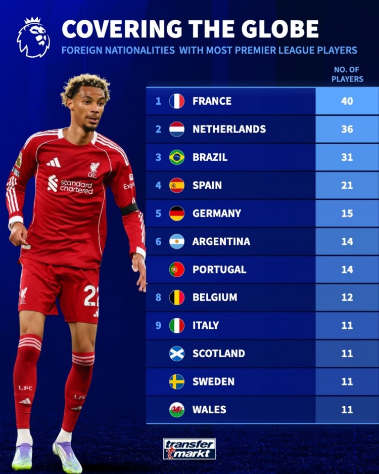英超各国外援数:法国40人、荷兰36人、巴西31人