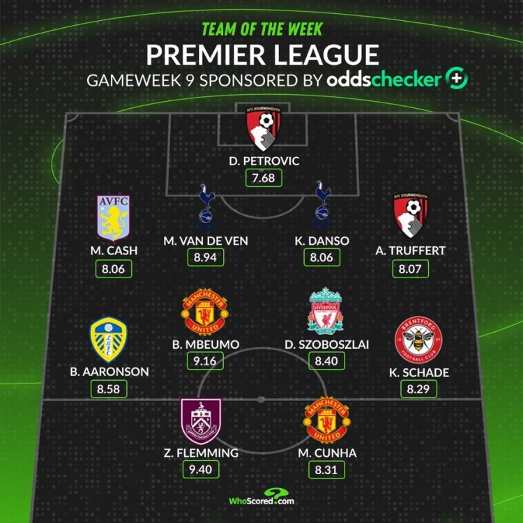 足球比分网10月27日讯 英超联赛第9轮已经完赛,whoscored也列出了本轮英超评分最佳阵,曼联、热刺和伯恩茅斯各2将入围。 whoscored第9轮英超最佳阵: 门将:佩特洛维奇(伯恩茅斯,7.68分) 后卫:卡什(阿斯顿维拉,8.06分)、范德芬(热刺,8.94分)、丹索(热刺,8.06分)、阿德里安-特吕费尔(伯恩茅斯,8.07分) 中场:布伦登-阿隆森(利兹联,8.58分)、姆伯莫(曼联,9.16分)、索博斯洛伊(利物浦,8.40分)、沙德(布伦特福德,8.29分) 前锋:弗勒明(伯恩利,9.40分)、库尼亚(曼联,8.31分)
