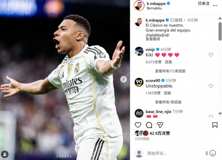 足球比分网10月27日讯 在本轮西甲,皇马2-1击败巴萨。 本场比赛姆巴佩破门,赛后他也在个人社媒晒出庆祝进球照片,配文写道:“国家德比胜利属于我们,球队展现出很棒的活力,皇马加油!”