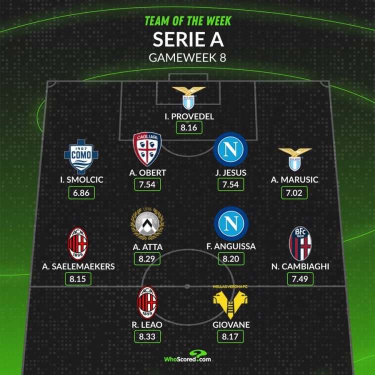 whoscored本轮意甲最佳阵:莱奥、安古伊萨领衔,