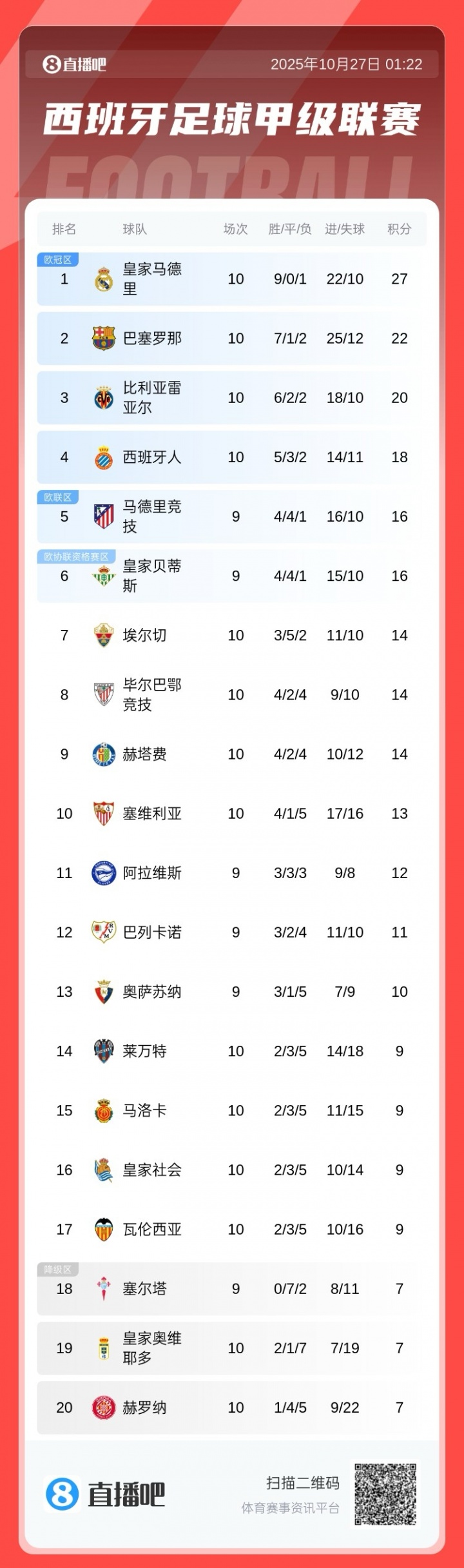 西媒Archivo VAR在赛后为本场比赛主裁判格拉多打分:“灾难级表现,2.5分。” 主场复仇!西甲积分榜:皇马5分优势领跑,巴萨第2,西班牙人第4