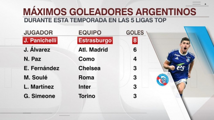 足球比分网10月27日讯 ESPN统计了阿根廷球员在本赛季五大联赛中的进球数量,并列出五大联赛阿根廷球员射手榜,斯特拉斯堡大中锋帕尼切利8球居首。 本赛季五大联赛阿根廷球员射手榜(仅统计联赛进球): 帕尼切利(斯特拉斯堡)——8 阿尔瓦雷斯(马竞)——6 尼科-帕斯(科莫)——4 恩佐-费尔南德斯(切尔西)——3 苏莱(罗马)——3 劳塔罗(国米)——3 吉奥瓦尼-西蒙尼(都灵)——3 |