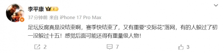 李平康:足坛反腐真是没结束啊,又有重要“交