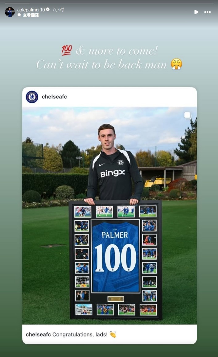 足球比分网10月29日讯 帕尔默在Instagram晒出自己的切尔西百场纪念球衣,并展望了未来。 帕尔默写道:“100场!接下来还有更多!哥们我已经等不及要回归赛场了!” |