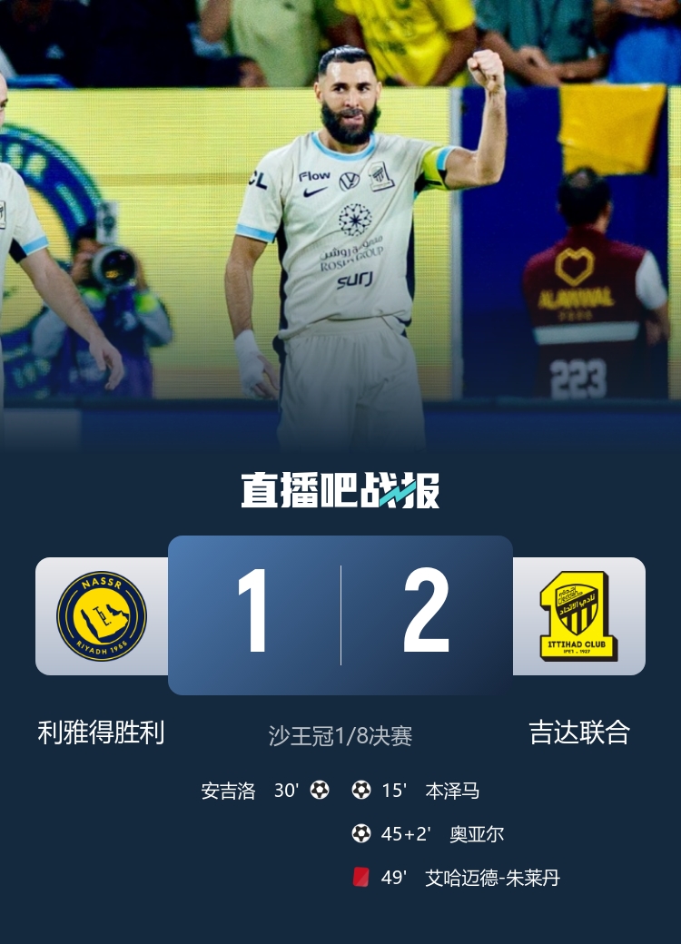 本泽马推射破门,奥亚尔抽射建功,最终利雅得胜利1-2十人吉达联合无缘八强。 本赛季已失两冠!沙王冠出局,C罗胜利生涯仍无正式赛事冠军 先赛3分领跑!那不勒斯1-0莱切两连胜 安古伊萨制胜瓦尼亚扑点