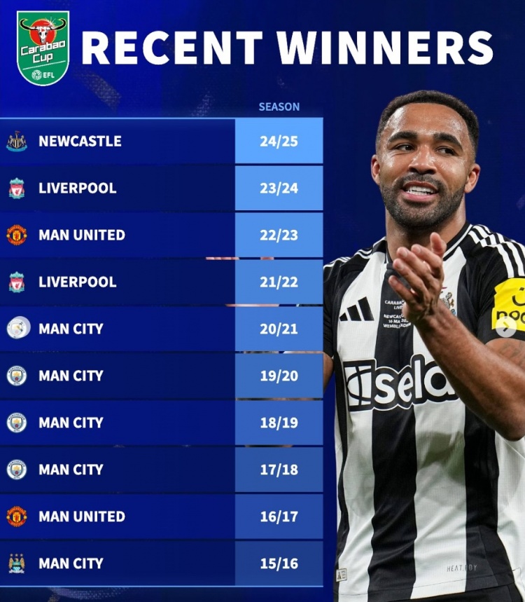 足球比分网10月29日讯 《转会市场》统计了英格兰联赛杯近10年冠军,曼城共计赢得5次冠军堪称最大赢家。 德转列近10年联赛杯冠军: 纽卡斯尔联,2024-25赛季 利物浦,2023-24赛季 曼联,2022-23赛季 利物浦,2021-22赛季 曼城,2020-21赛季 曼城,2019-20赛季 曼城,2018-19赛季 曼城,2017-18赛季 曼联,2016-17赛季 曼城,2015-16赛季